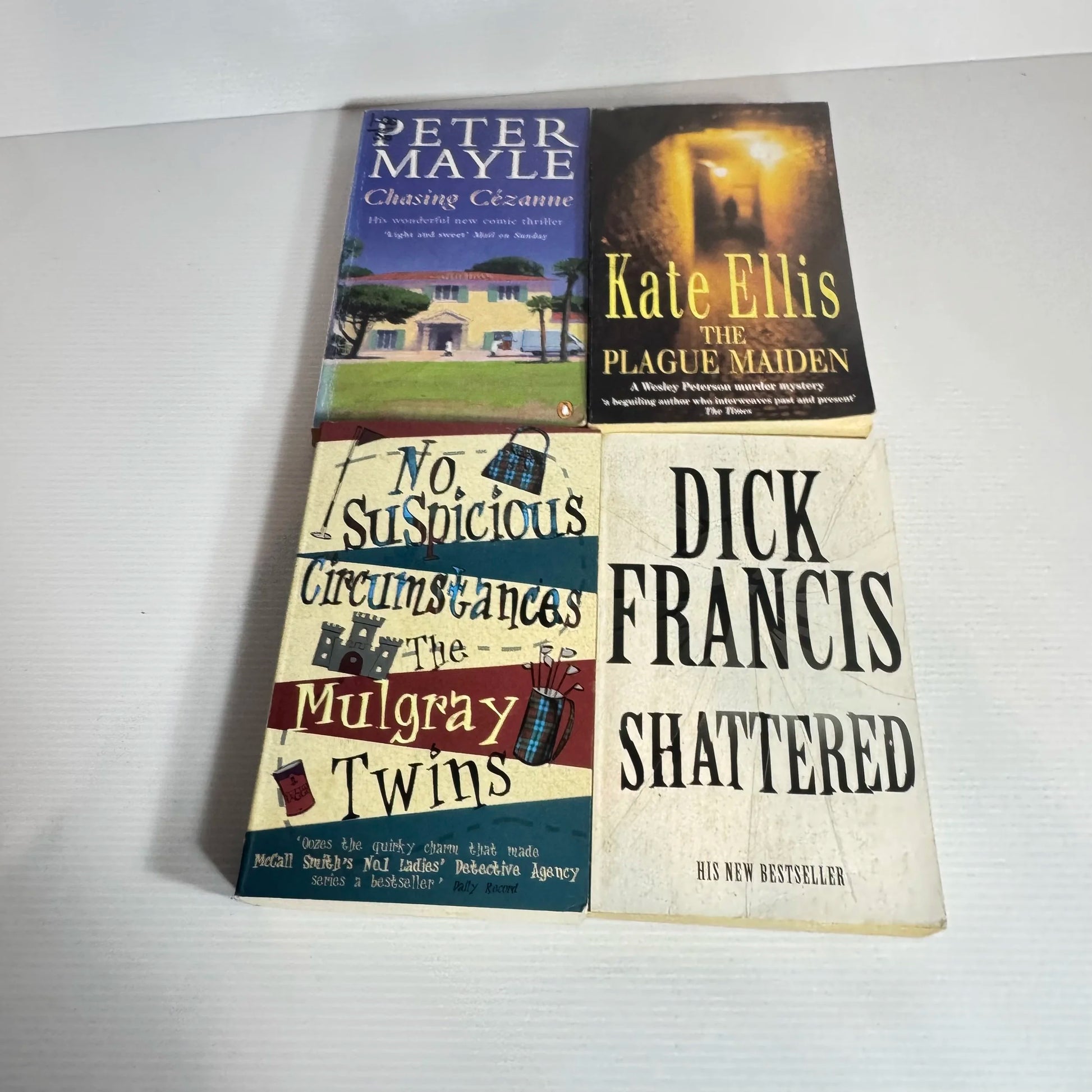 Titles: The Plague Maiden - Kate Ellis, Shattered - Dick Francis, Chasing Cezanne - Peter Mayle, No Suspicious Circumstances - The Mulgray Twins