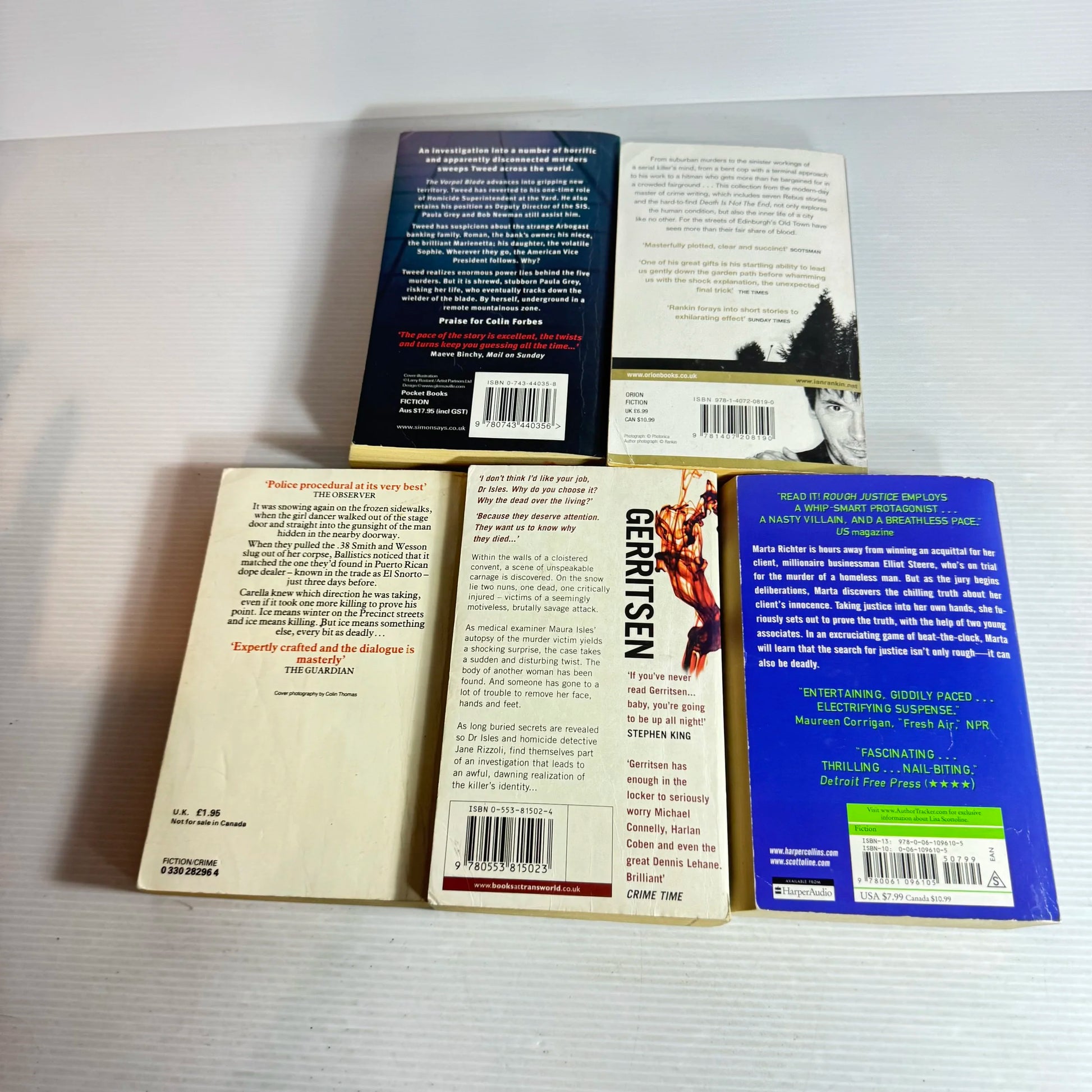 Titles: The Sinner - Tess Gerritsen, Ice - McBain, Rough Justice - Lisa Scottoline, The Vorpal Blade - Colin Forbes, Beggars Banquet - Ian Rankin