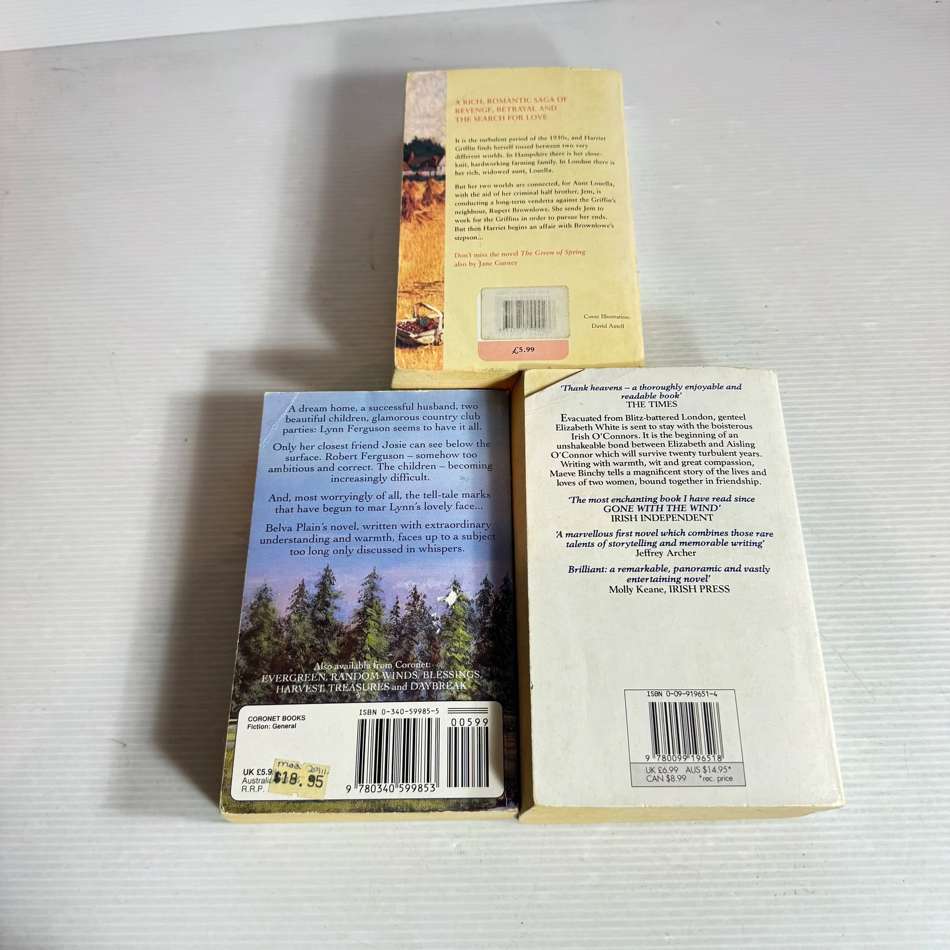 Titles : Whispers - Belva Plain, Gone Tomorrow - Jane Gurney, Light A Penny Candle - Maeve Binchy