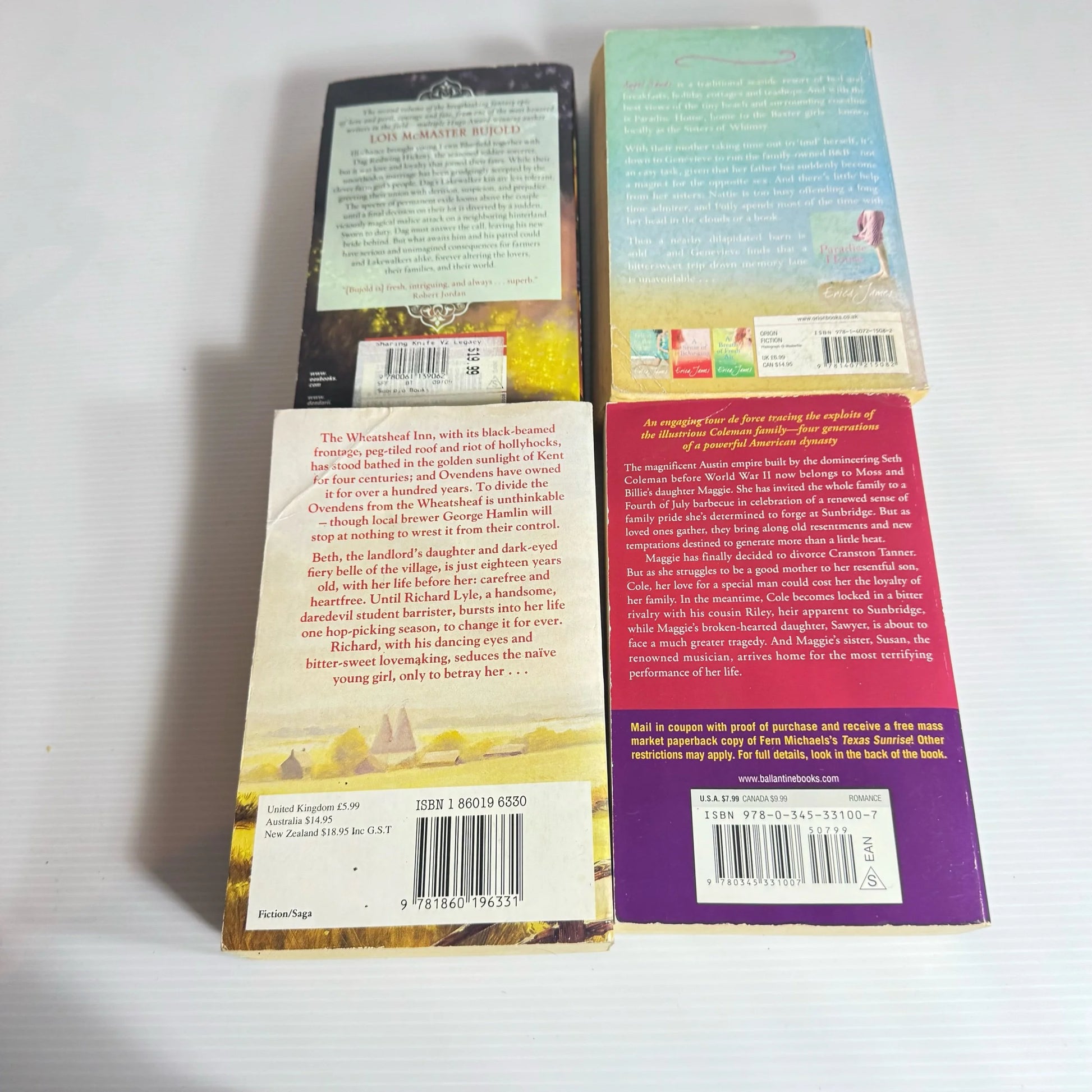 Titles : Paradise House - Erica James, Texas Heat - Fern Michaels, The Sharing Knife - Louis McMaster Bujold, Look for Me By Moonlight - Harriet Hudson