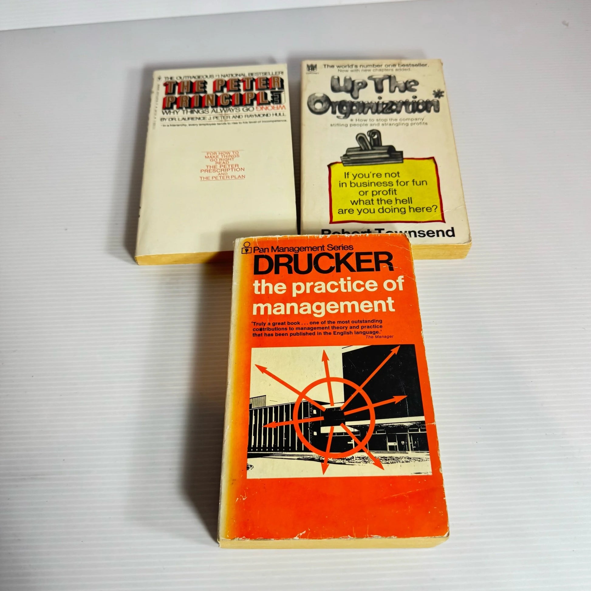 Titles : The Peter Principle - Dr Laurance J Peter & Raymond Hall (1977), Up The Organization - Robert Townsend (1971), The Practice of Management - Peter F. Drucker (1973)