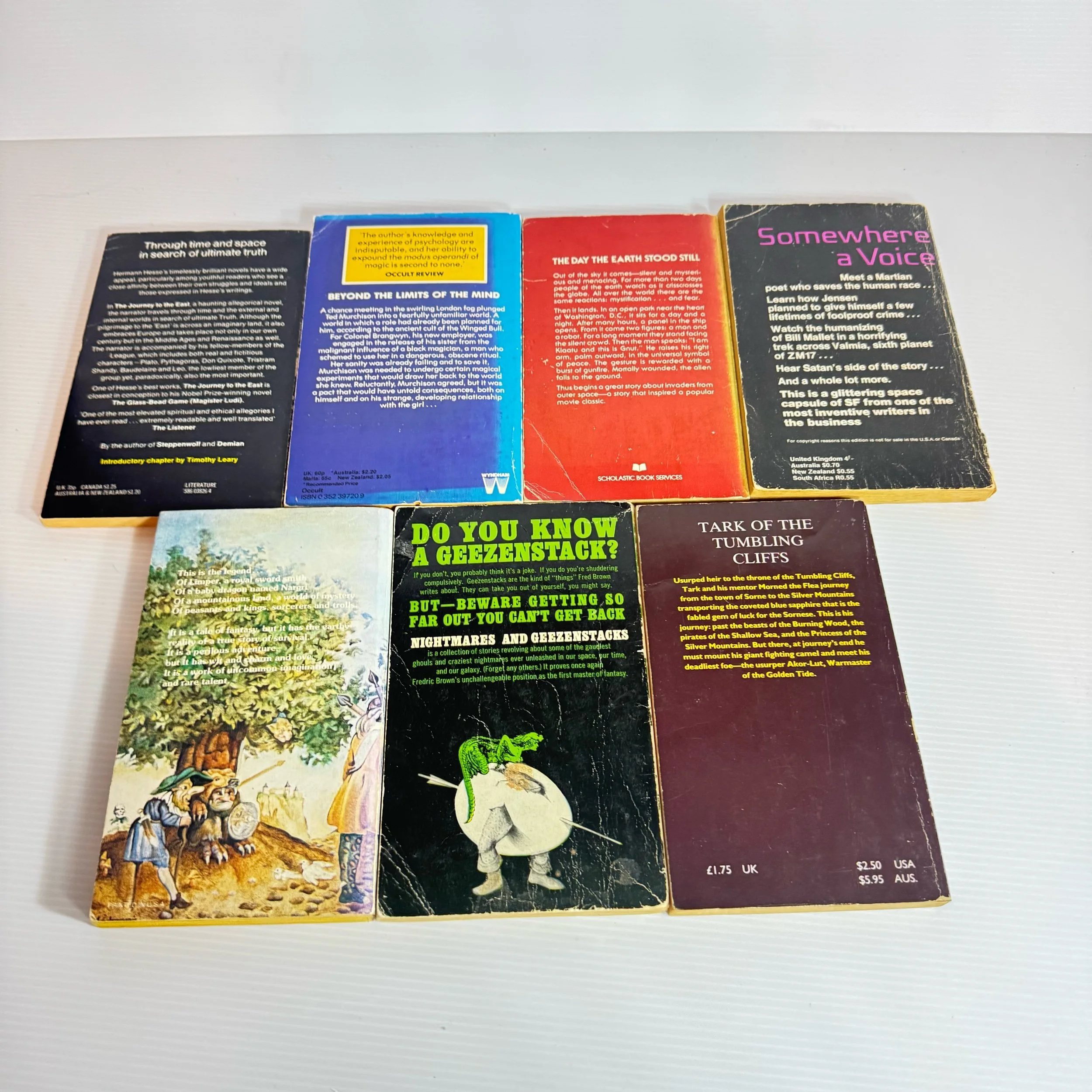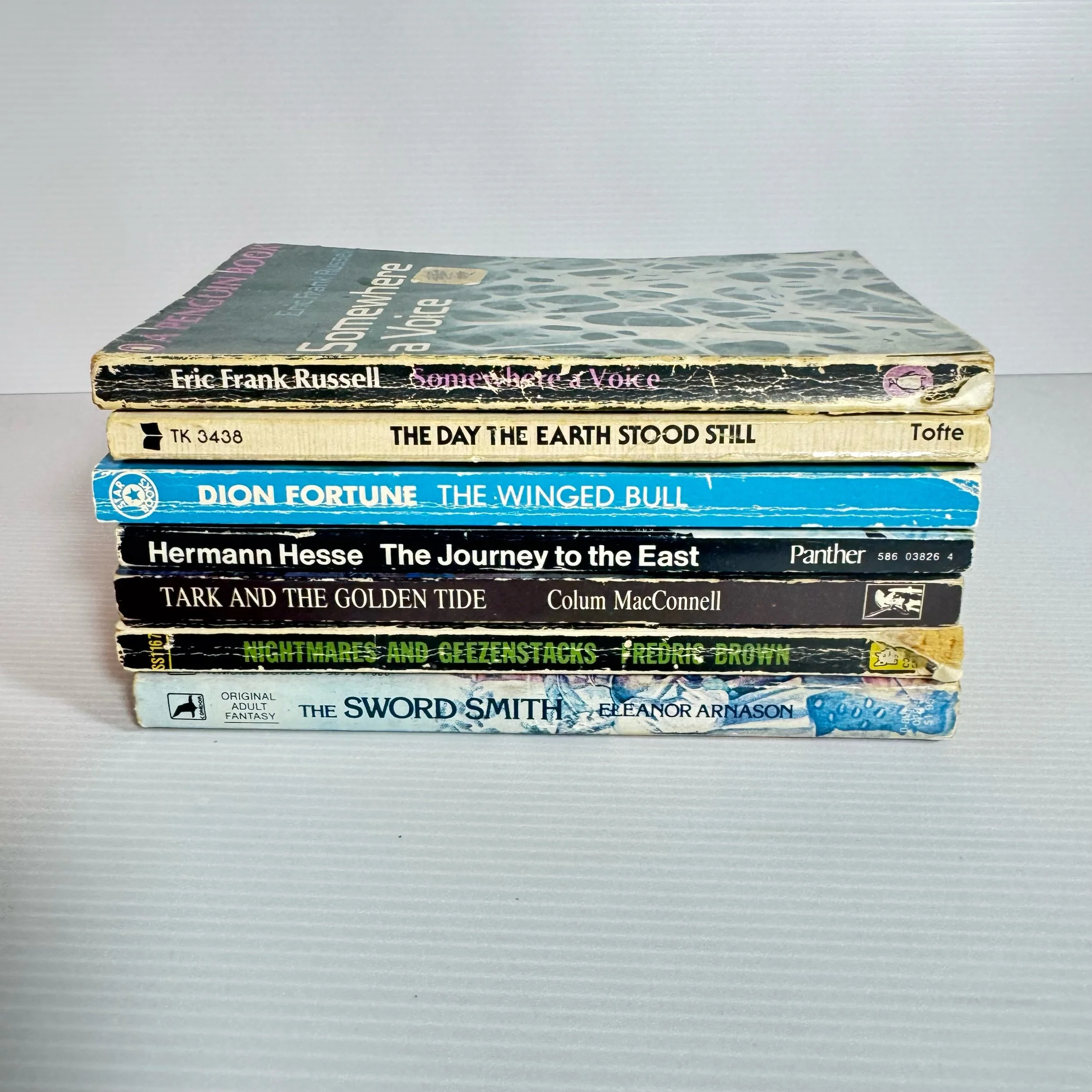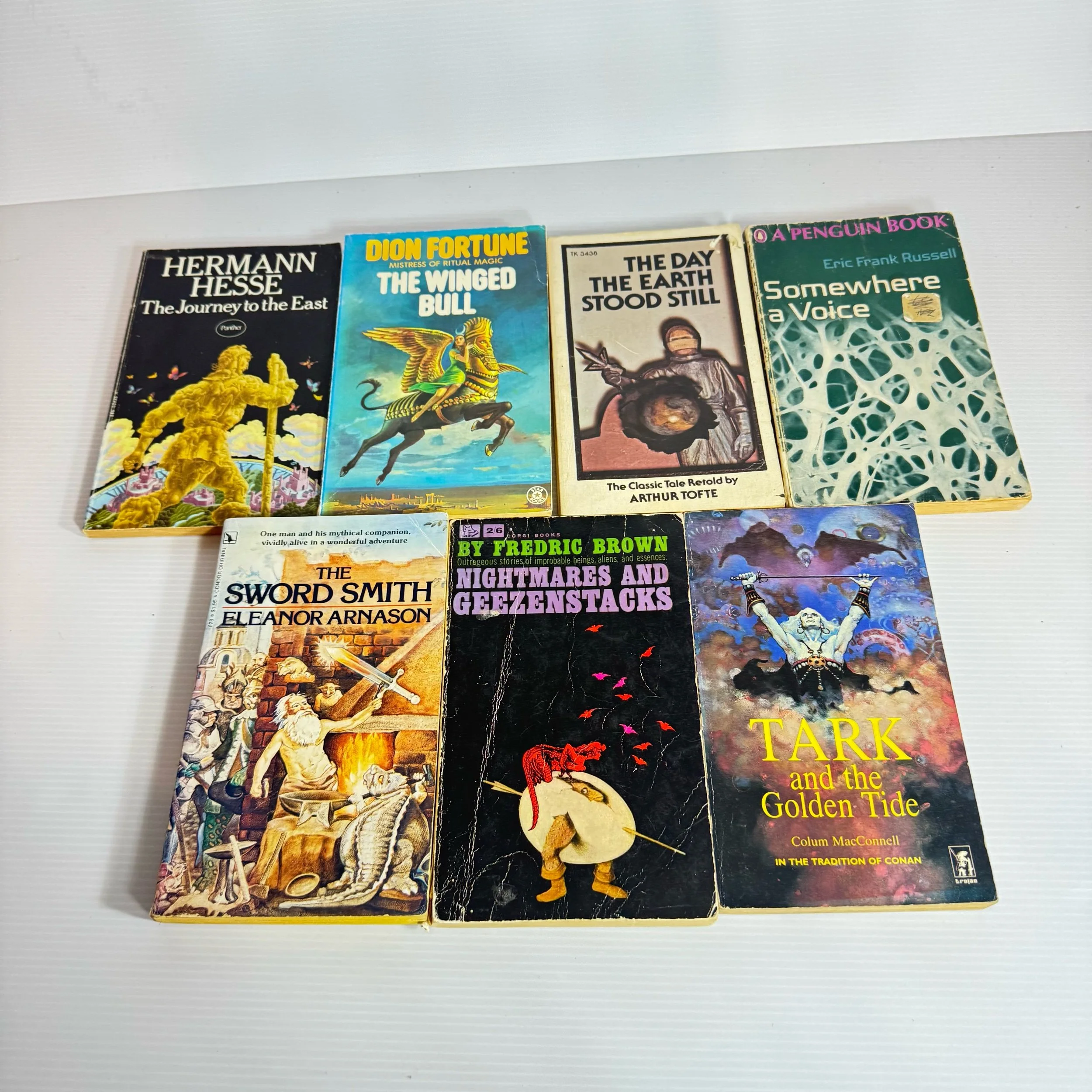 Titles: The Sword Smith - Eleanor Arnason, The Journey to the East - Hermann Hesse, Tark and the Golden Tide - Colum MacConnell, Nightmares and Geezenstacks - Fredric Brown, Somewhere a Voice - Eric Frank Russell, The Day The Earth Stood Still - Arthur Tofte, The Winged Bull - Dion Fortune