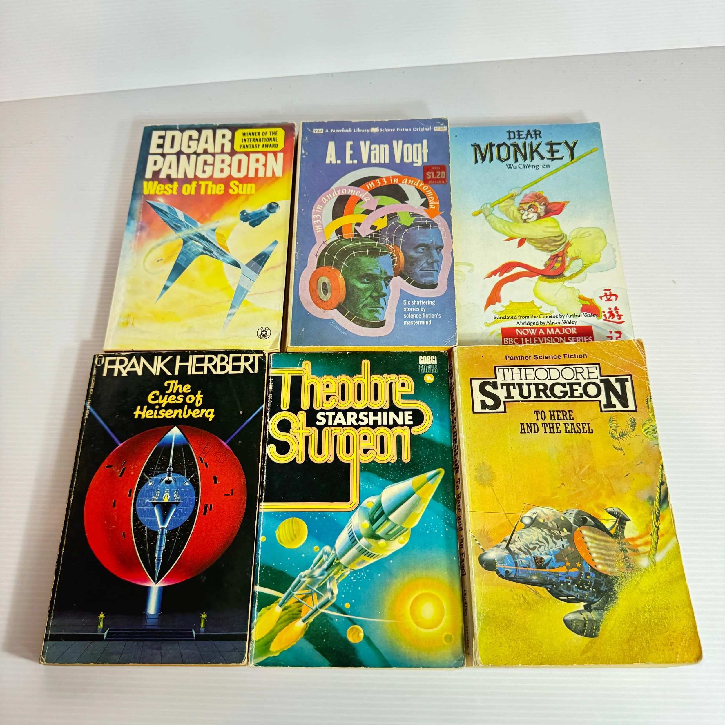 Titles: M 33 In Andromeda - A.E. Van Vogt, Dear Monkey - Wu Cheng-en, Sunshine - Theodore Sturgeon, To Here and the Easel - Theodore Sturgeon, The Eyes of Heisenberg - Frank Herbert, West of the Sun - Edgar Pangborn
