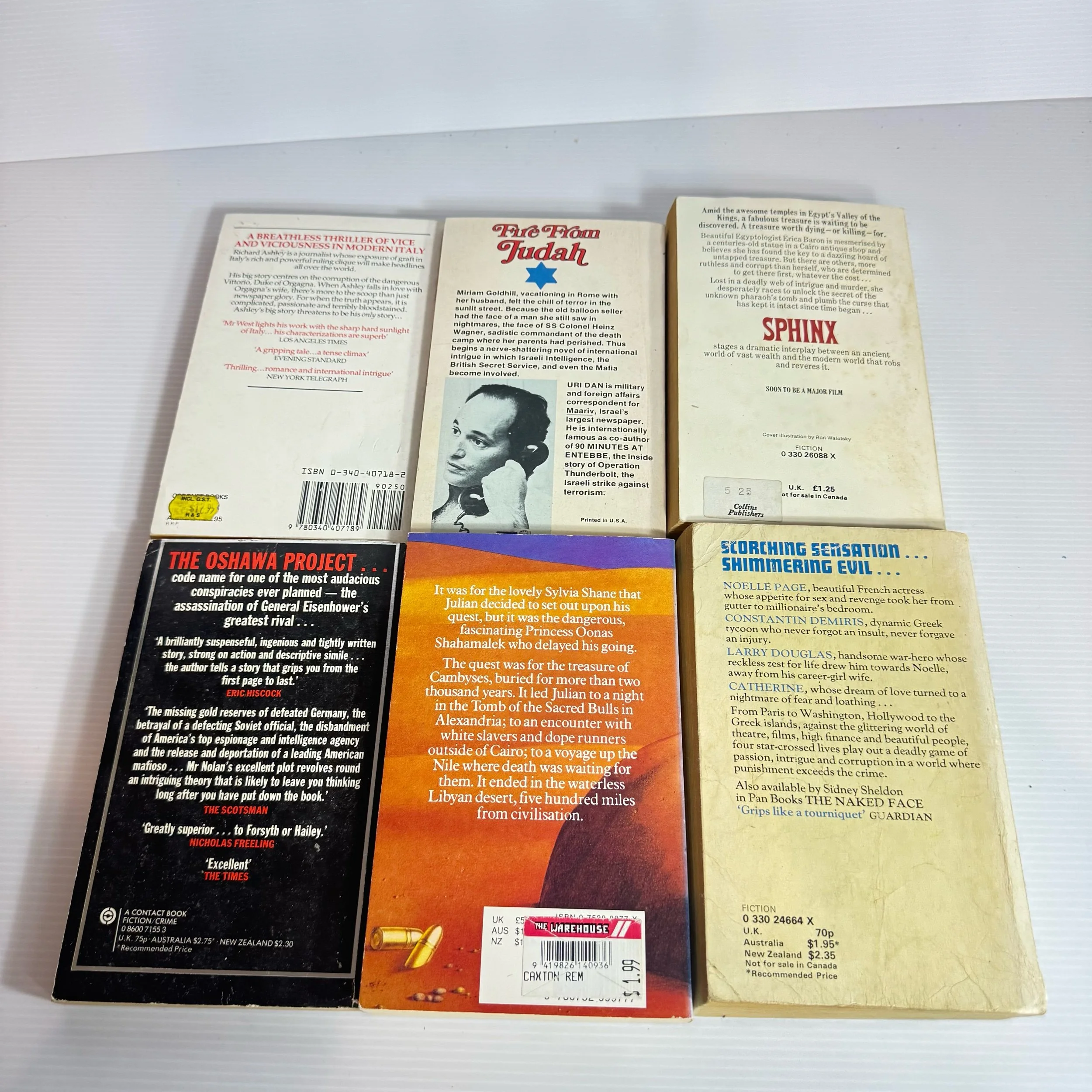 Titles: The Big Story - Morris West, The Eichmann Syndrome - Uri Dan & Edward Radley, Sphinx - Robin Cook, The Quest of Julian Day - Dennis Wheatley, The Oshawa Project - Frederick Nolan, The Other Side of Midnight - Sidney Sheldon